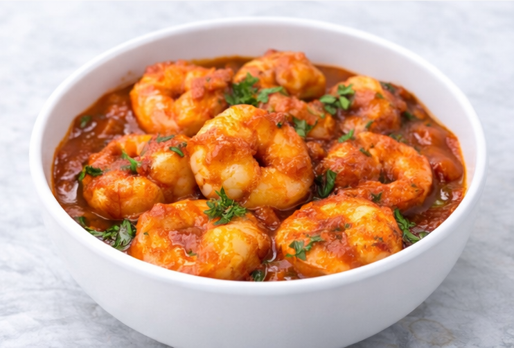 Prawn cooked with onions, capsicum, and special spices in a creamy tomato sauce